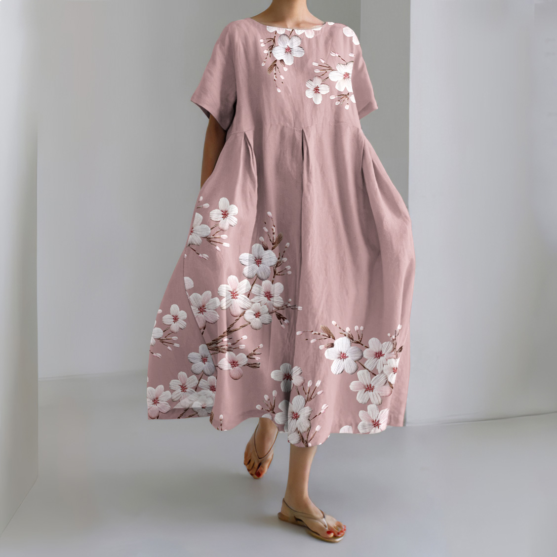 Casual Cherry Blossom Print Short Sleeve Linen Blend Dress